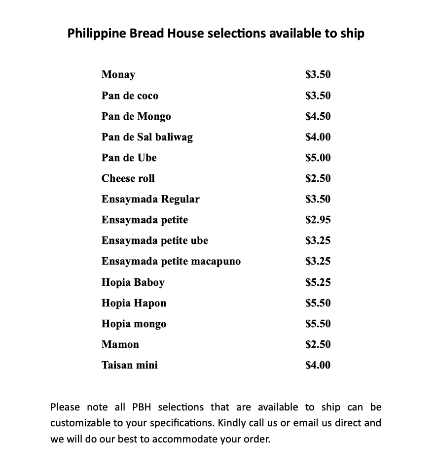 PBH offers a wide range of exciting products. The main are the “Brioche Breads” or Ensaymadas. They are a sweet composition , smeared with butter, sugar and cheese flakes. These fist-sized brioche can be filled with coconut or purple yam. Pan de Sal or roll is the staple bread for most Filipinos. They are sweet in taste and golden in color. Pan de Sal is often sold by the dozen and can also be sold with something in them. Example Pork Bun. and or Coco Bun or Pan de Coco. Conventional Cakes and Native delicacies are also available.